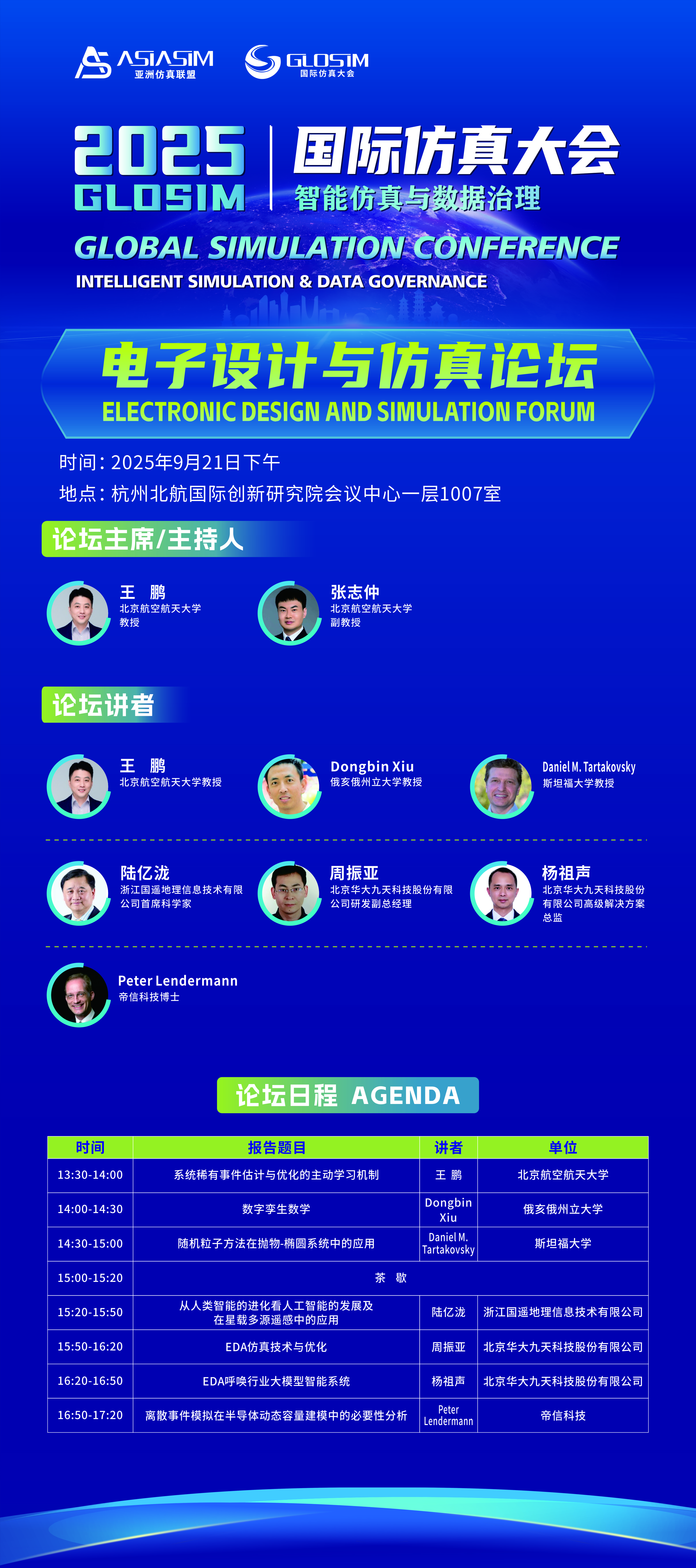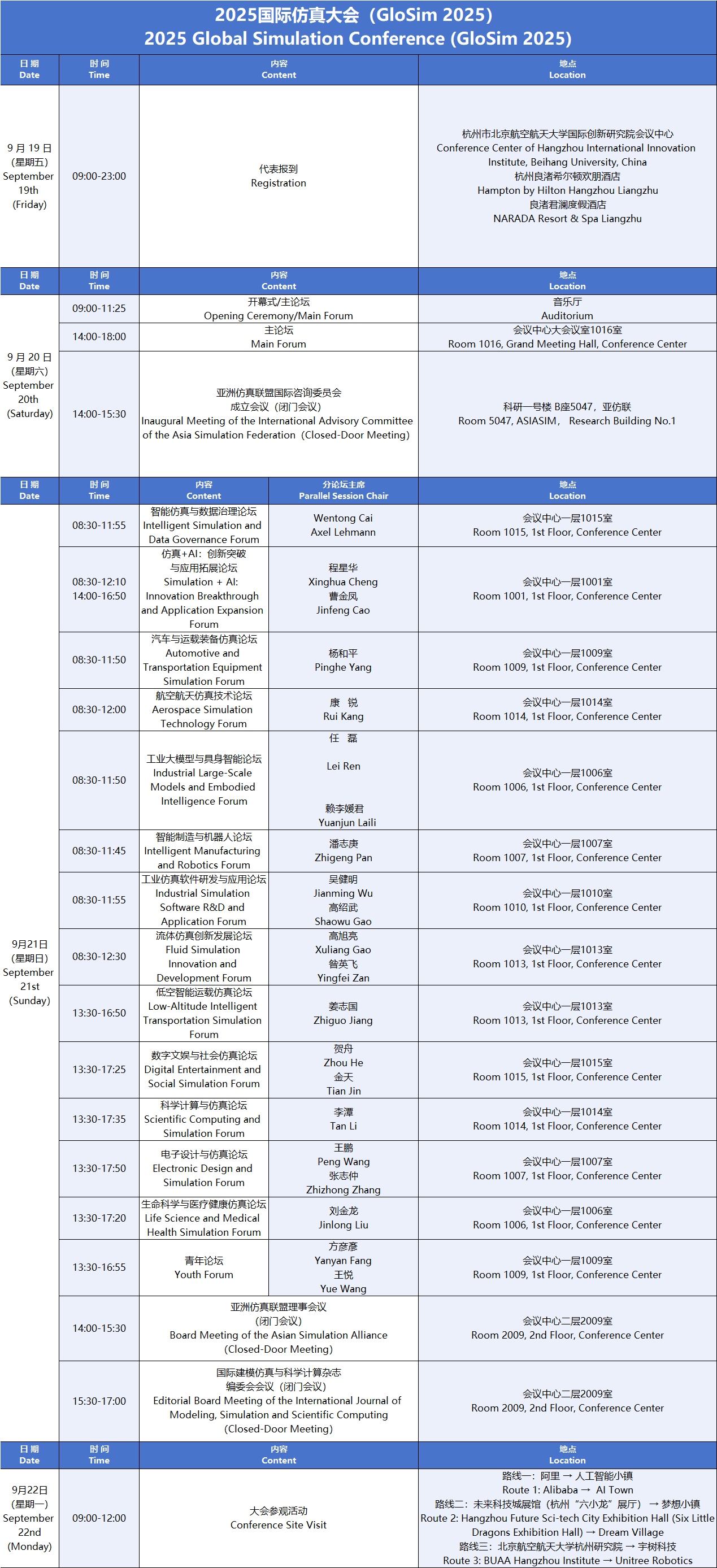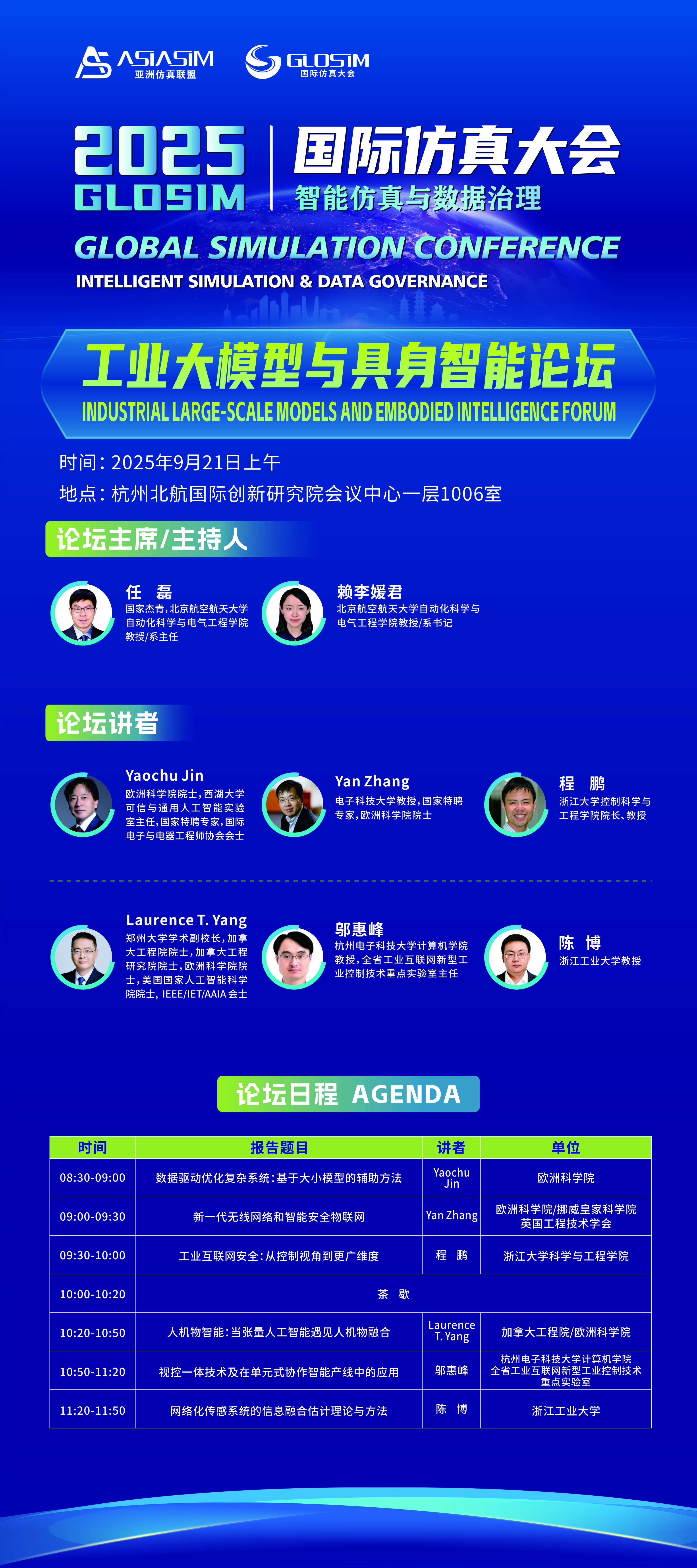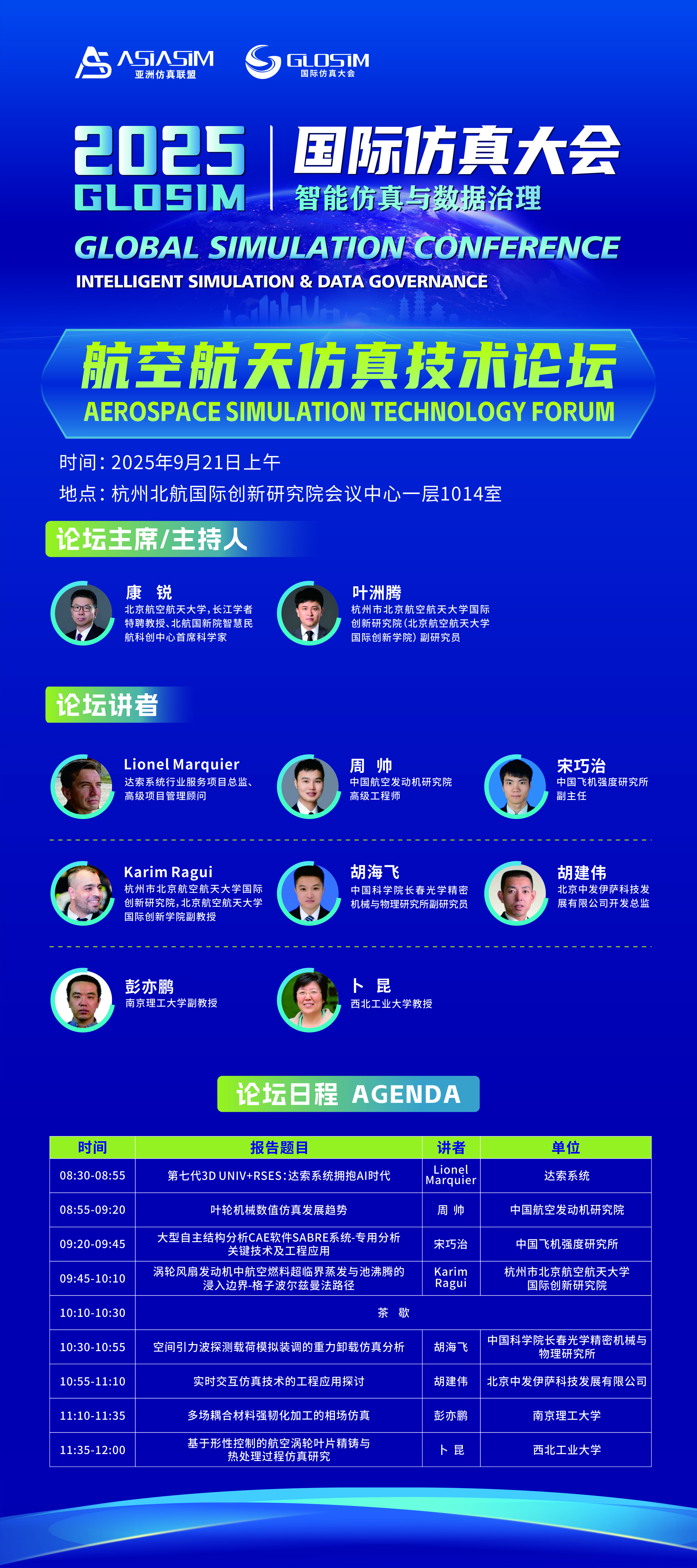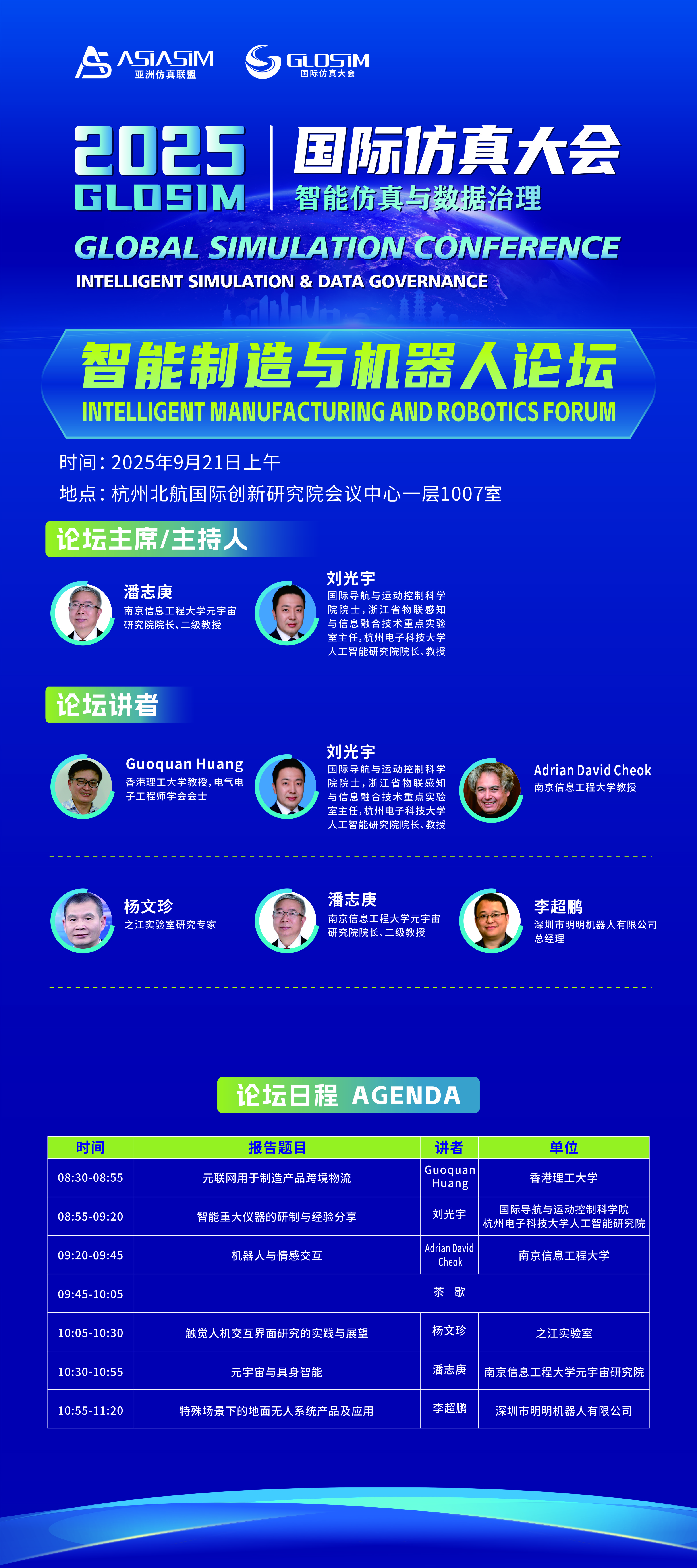 当前,全球智能化数字化浪潮不断翻涌,仿真的内涵和外延不断拓展,仿真技术在各领域重要作用愈发凸显,“万物皆可仿真”正逐步成为学界与产业界共识。为充分落实国际科技组织参与国际科技治理、深化国际交流合作的责任与担当,积极推动全球仿真科技创新和产业互促,落实新技术、新成果规模化落地应用,加速仿真技术在更广泛场景中融合创新,亚洲仿真联盟于2025年9月19-22日在中国浙江省杭州市北京航空航天大学国际创新研究院(杭州市余杭区瓶窑镇双红桥街166号)举办2025国际仿真大会。
